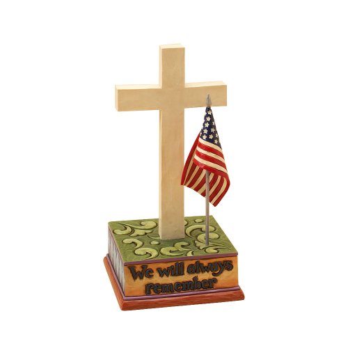 Tribute Cross from Enesco by nationally renown artist Jim Shore. We Will Always Remember is a special tribute to our military. A distinctive bereavement gift commemorating the life of a fallen soldier or veteran. In front of the cross is a resin American flag on a metal pole.